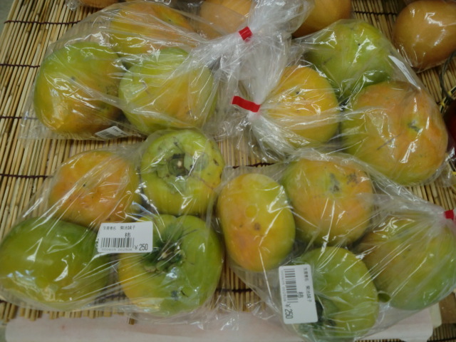 柿といえば赤く色付いたものを連想しがちですが、この柿はもともとあまり色付きません。赤くなりすぎると美味しくなくなってしまうという…。